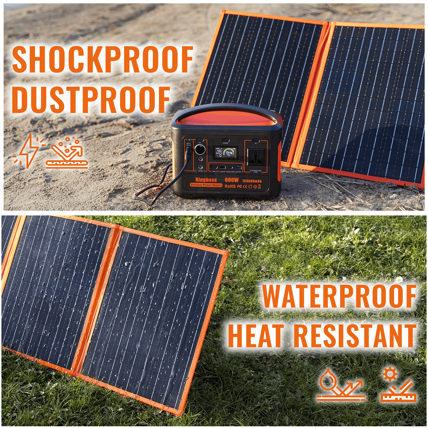 The foldable solar panel is a one-piece design. The waterproof solar panel (the front of the solar panel is not afraid of the rain; but the output ports are not waterproof; to avoid damage don't drop big amounts of water on them) and heat-resistant solar panel (if the temperature of the surface is up to 50º the output power and the efficiency will be affected); with special pocket zippers for added protection in your outdoors adventures. With the three-kickstand design; the easy to set up solar panel can be effortlessly positioned and angled for maximum sun exposure; providing the most effective solar coverage possible. Together with the solar panel; the package includes the user manual; a 2m cable DC5521 and 4 connectors: